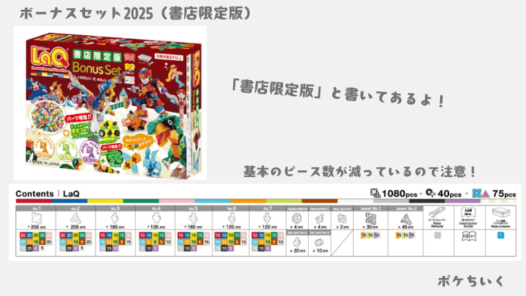 2024年11月発売の「ボーナスセット2024」との違いは、ピース数・価格・クリアパーツの色が異なります。